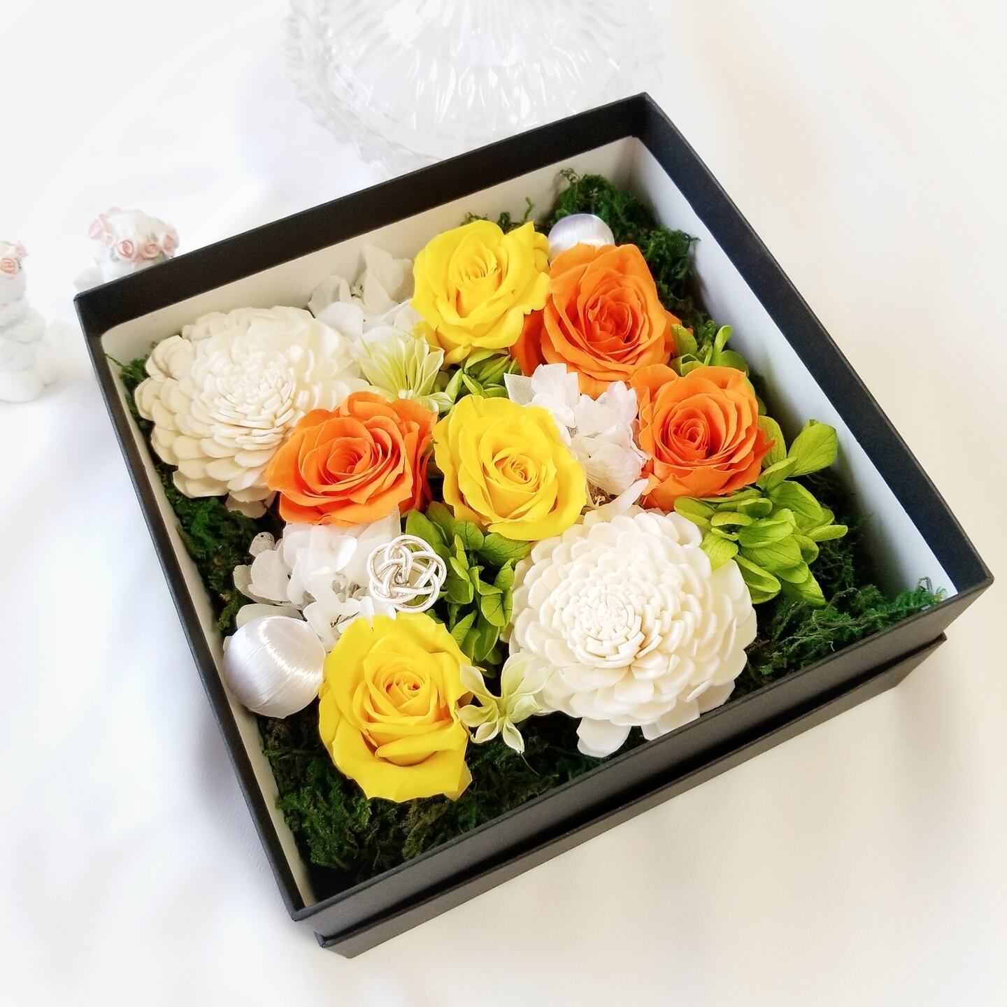 心がハッピーになる黄色とオレンジのバラをメインに爽やかなアレンジ。